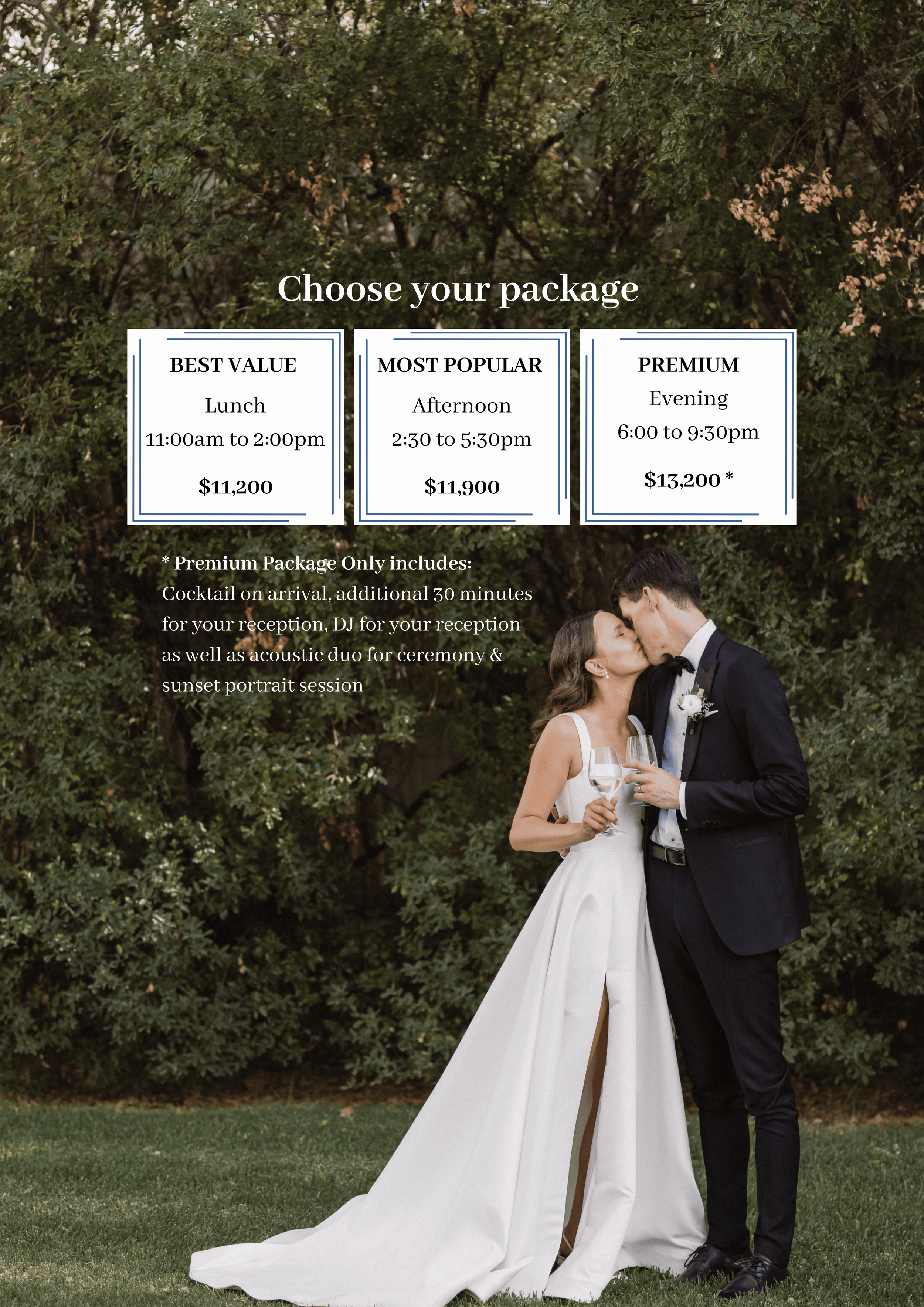 Included: Venue for ceremony & reception, food & drinks, photography & content creation, celebrant & personalised ceremony, music, flowers, all the styling & management on the day. For up to 40 people.